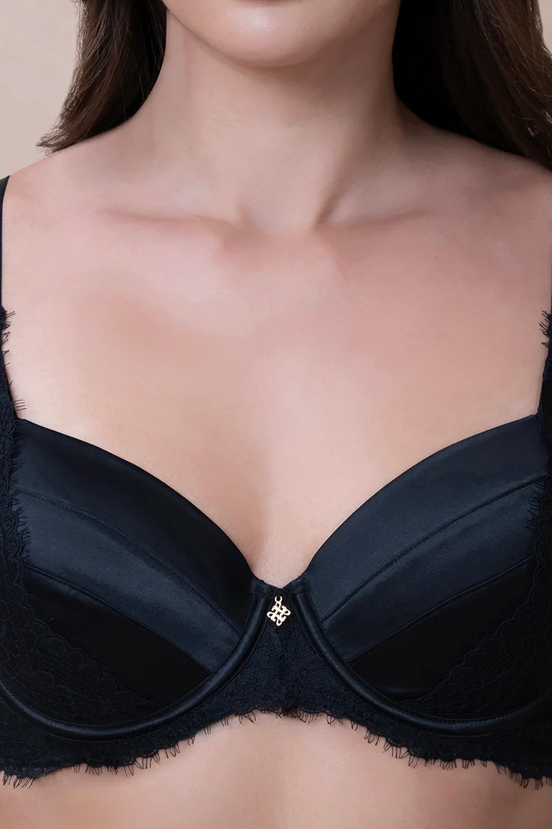 Indulge in a symphony of romance and refinement with the Amore Demi Bra. Designed to celebrate femininity, this exquisite piece blends delicate lace with luxurious satin for a perfect balance of excitement and elegance.