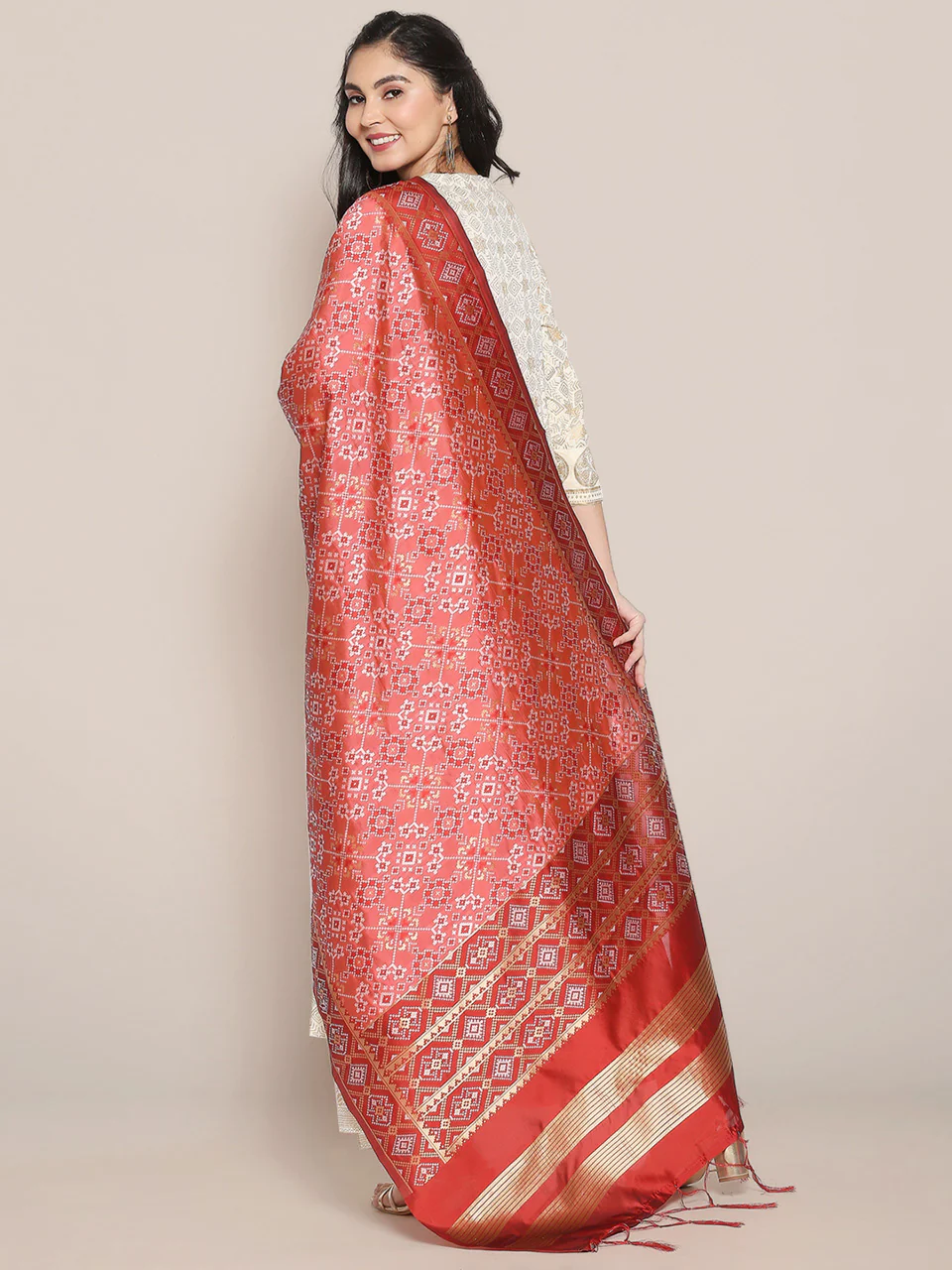 Add a touch of elegance to your wardrobe with this exquisite piece of beautiful Banarasi Silk Dupatta. Swathed with elegant Patola style weaving all over, this classic stunner is a must in your ethnic collection.