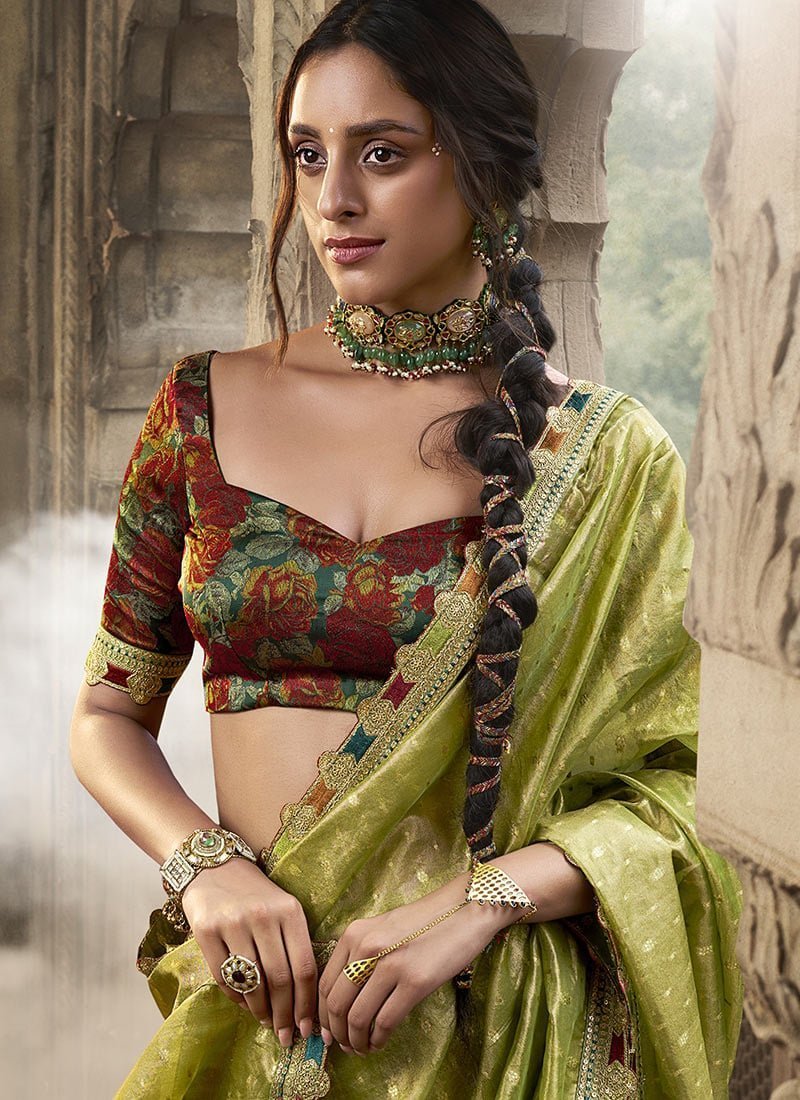 Pista Green Tissue Jacquard Zari Saree Festive Wear